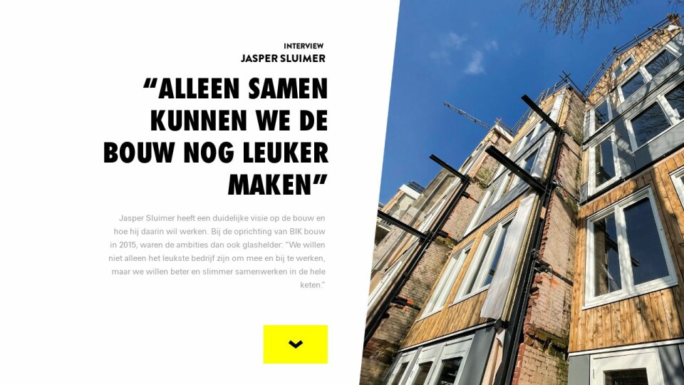 Jasper Sluimer heeft een duidelijke visie op de bouw en hoe hij daarin wil werken. Bij de oprichting van BIK bouw in 2015, waren de ambities dan ook glashelder: “We willen niet alleen het leukste bedrijf zijn om mee en bij te werken, maar we willen beter en slimmer samenwerken in de hele keten.”
