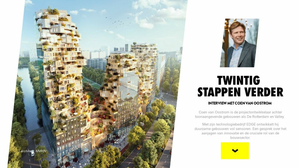 CvO: “In zekere zin wel. Wij zijn met EDGE al twintig stappen verder en zouden al veel meer willen doen. Maar aannemers komen soms terug bij ons en zeggen dan: ‘Al jullie projecten zijn zó ingewikkeld.’ Dat komt mede doordat de projecten die we doen zo groot zijn. Een project als Valley loopt in de honderden miljoenen. Bouwers vinden dat risicovol en zijn daardoor voorzichtig. Als je dan ook nog zegt: ‘Het moet nóg technologischer, vernieuwender en sneller’, dan zegt zo’n grote aannemer: ‘Doe even normaal, ik doe het niet.’ Je zult dus voorzichtig moeten zijn. Het moet net twee procent oncomfortabel worden voor de bedrijven met wie je werkt, maar niet twintig procent oncomfortabel, want dan lopen ze weg en komt er helemaal geen duurzaam gebouw.”