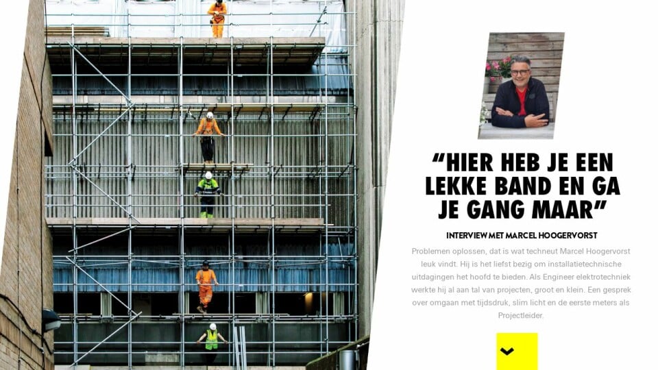 Problemen oplossen, dat is wat techneut Marcel Hoogervorst leuk vindt. Hij is het liefst bezig om installatietechnische uitdagingen het hoofd te bieden. Als Engineer elektrotechniek werkte hij al aan tal van projecten, groot en klein. Een gesprek over omgaan met tijdsdruk, slim licht en de eerste meters als Projectleider.