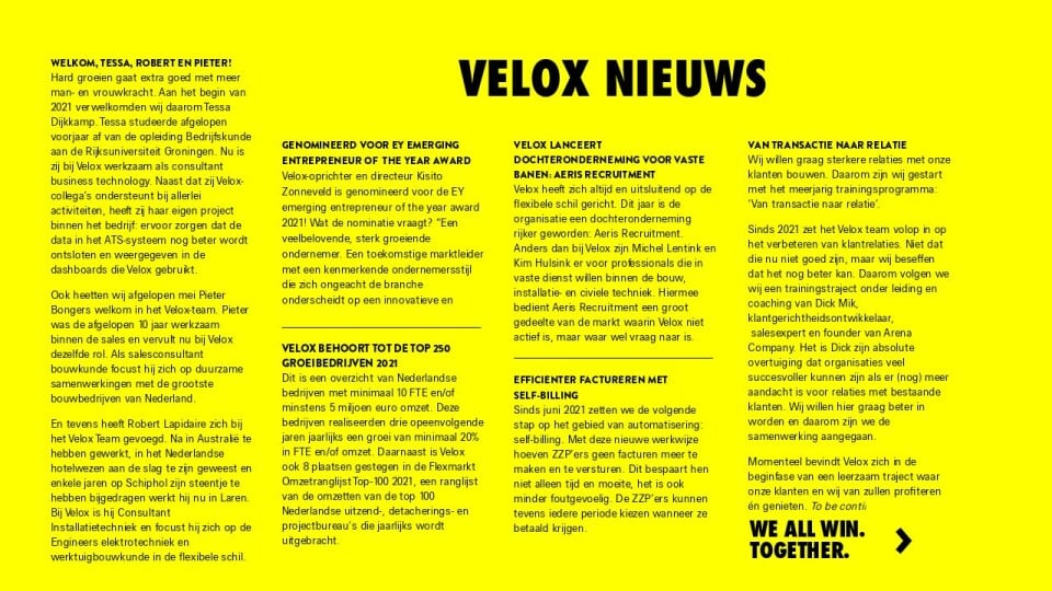 Velox heeft zich altijd en uitsluitend op de flexibele schil gericht. Dit jaar is de organisatie een dochteronderneming rijker geworden: Aeris Recruitment. Anders dan bij Velox zijn Michel Lentink en Kim Hulsink er voor professionals die in vaste dienst willen binnen de bouw, installatie- en civiele techniek. Hiermee bedient Aeris Recruitment een groot gedeelte van de markt waarin Velox niet actief is, maar waar wel vraag naar is.