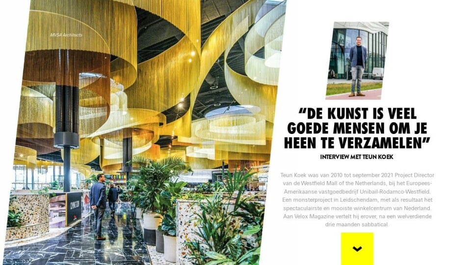Teun Koek was van 2010 tot september 2021 Project Director van de Westfield Mall of the Netherlands, bij het Europees-Amerikaanse vastgoedbedrijf Unibail-Rodamco-Westfield. Een monsterproject in Leidschendam, met als resultaat het spectaculairste en mooiste winkelcentrum van Nederland. Aan Velox Magazine vertelt hij erover, na een welverdiende drie maanden sabbatical.